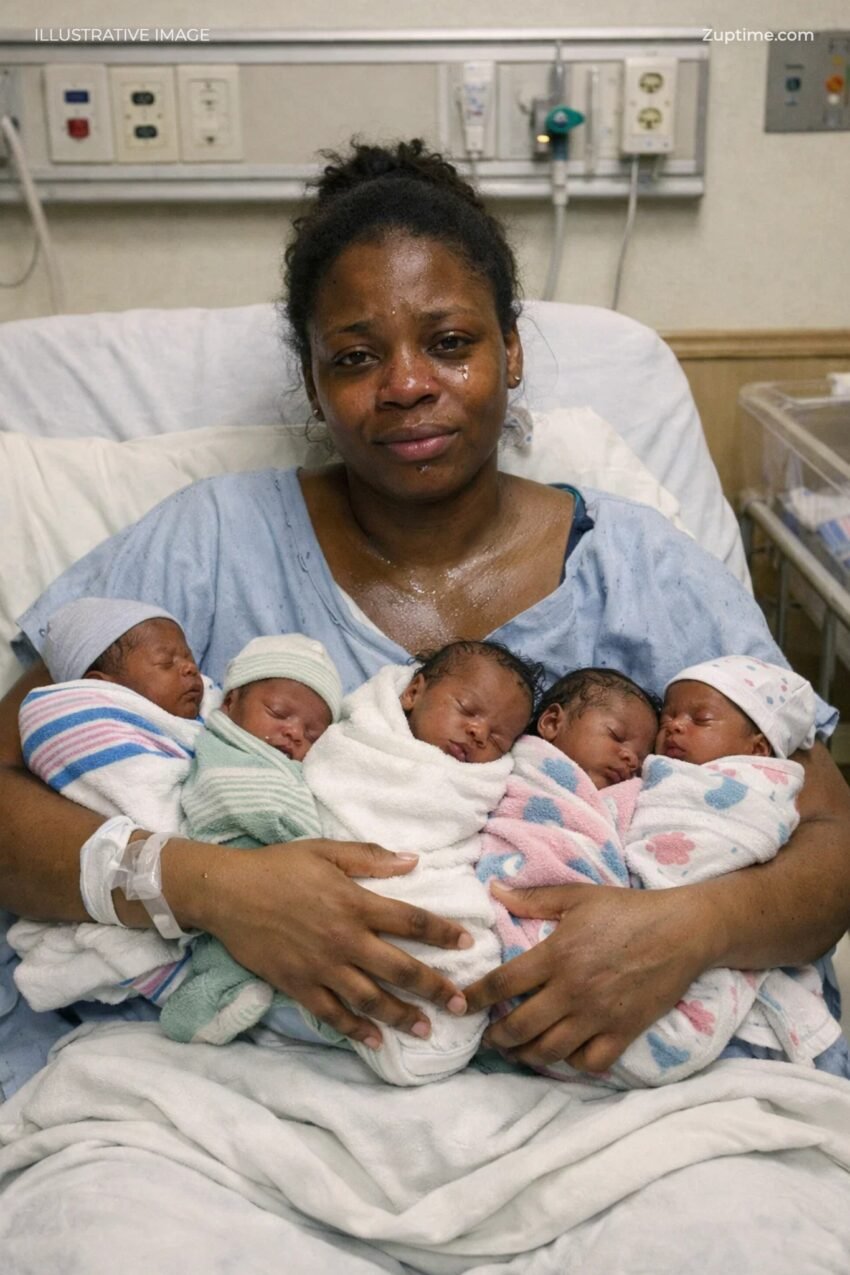 β€œIn a quiet hospital room, a mother gently holds her newborn quintuplets, surrounded by the fragile miracle of new life.”