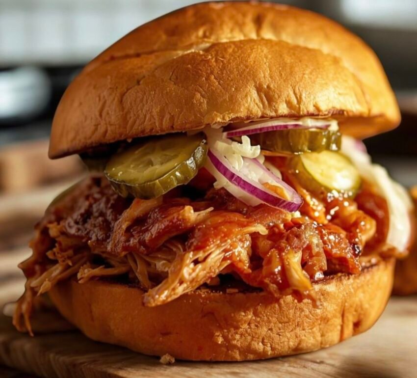 A juicy, smoky, and slightly sweet sandwich made with tender shredded chicken coated in BBQ sauce—perfect for quick dinners or game-day meals.