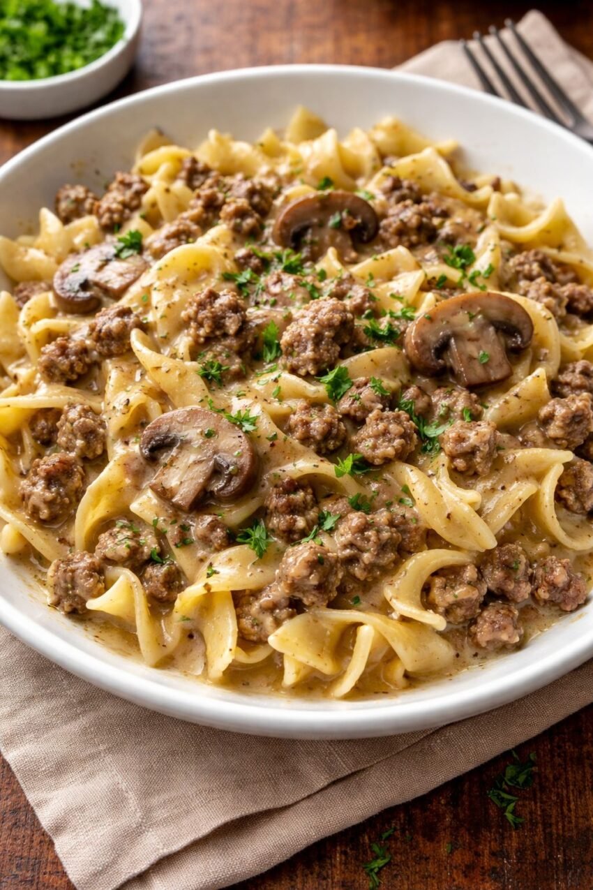 Beef Stroganoff is a classic creamy beef dish made with tender strips of beef cooked in a rich mushroom sauce, usually finished with sour cream and served over noodles, rice, or mashed potatoes. It’s smooth, savory, and comforting.
