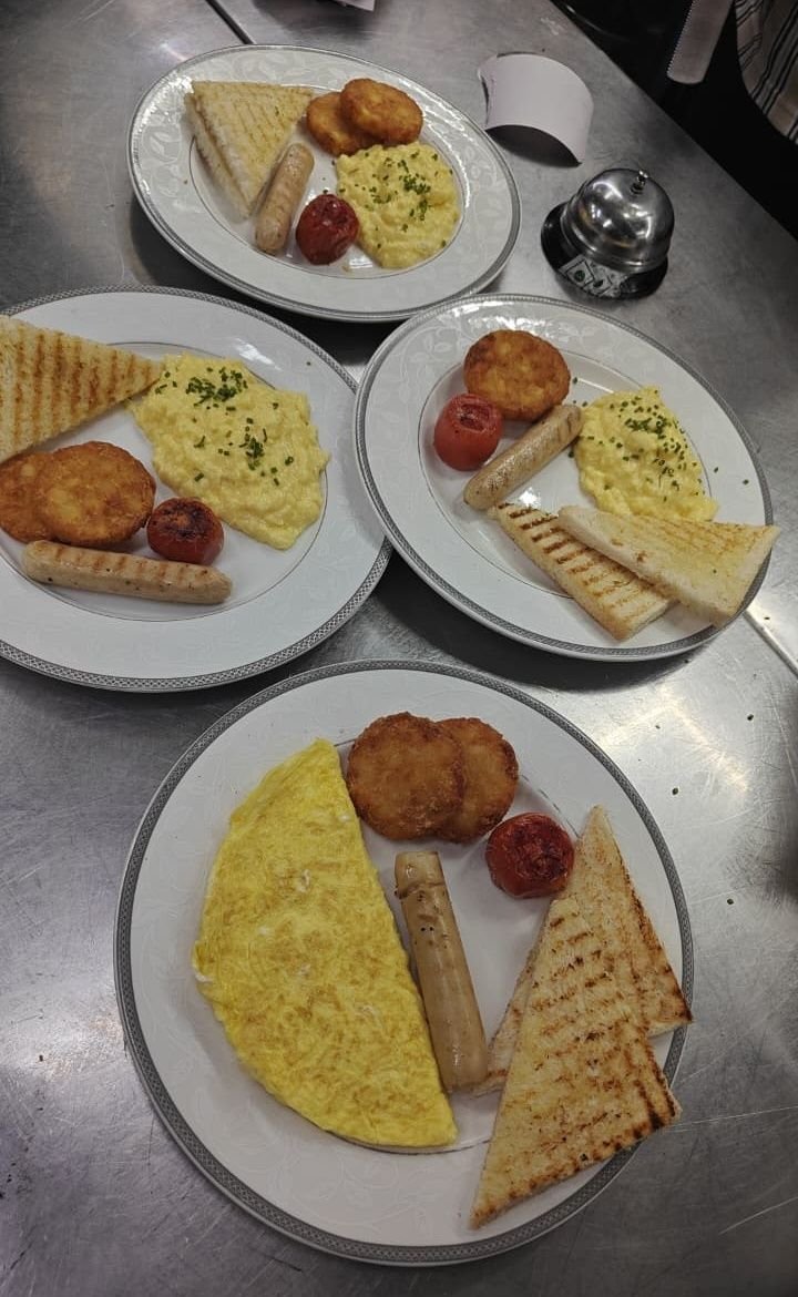 breakfast plates, likely featuring eggs, sausages, hash browns, tomatoes, and toasted bread.