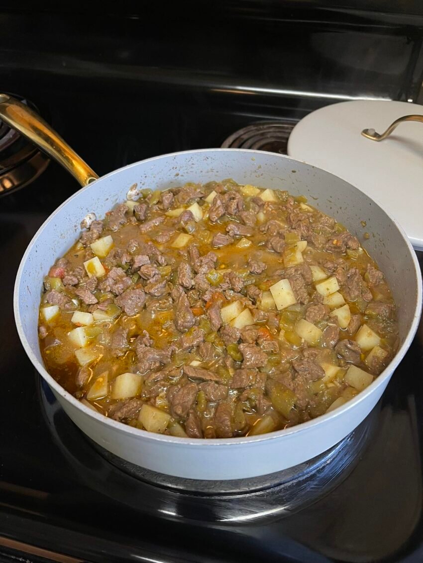 - Continue simmering 25–35 minutes until potatoes are tender and stew thickens.