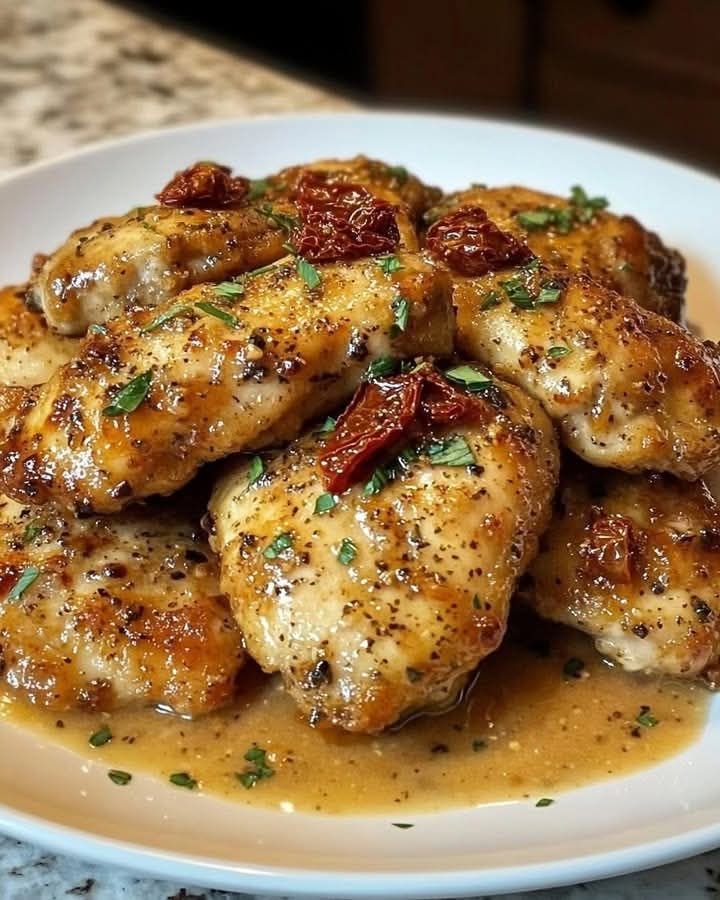 Chicken with sun-dried tomatoes is a rich, flavorful dish where tender chicken is cooked with concentrated, tangy-sweet dried tomatoes, often in a creamy or light sauce.