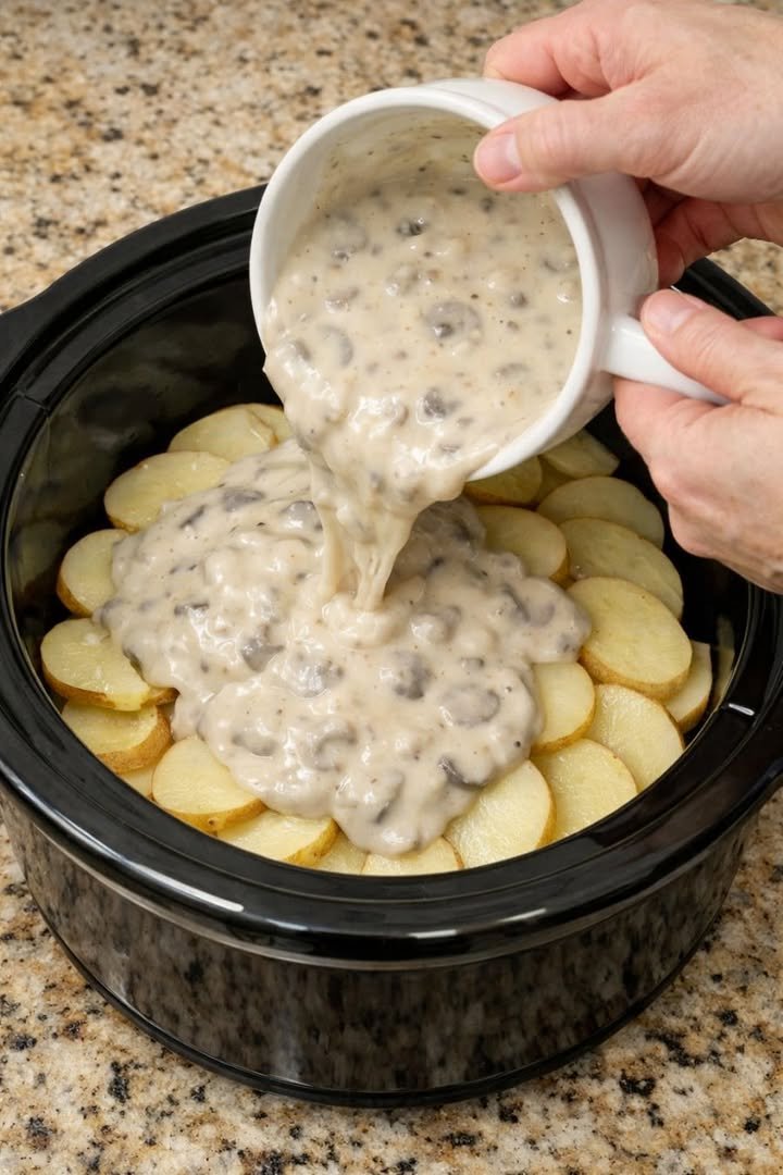 Cream of mushroom soup over sliced potatoes is a simple, cozy bake—kind of like a shortcut scalloped potato dish with extra creamy mushroom flavor.