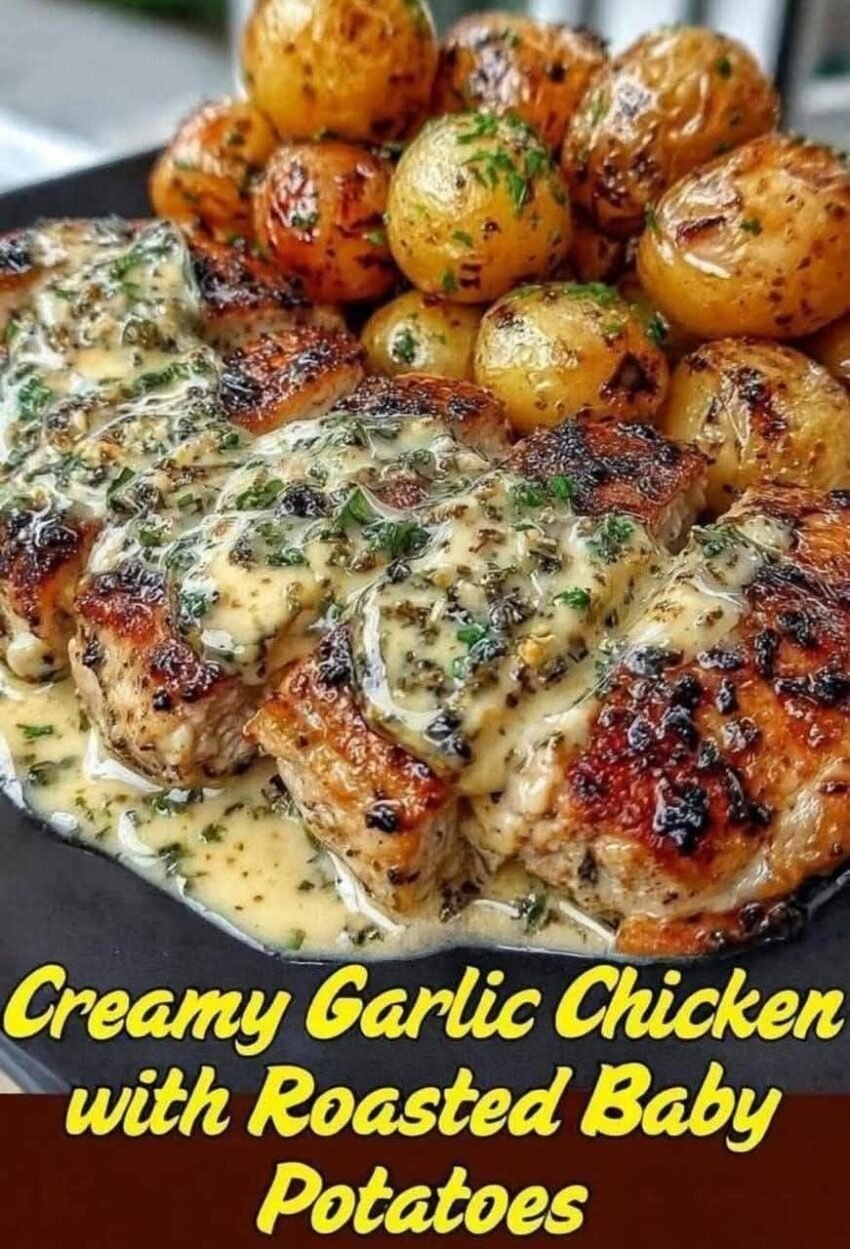 Here’s a rich, comforting Creamy Garlic Chicken with Roasted Baby Potatoes—crispy potatoes + juicy chicken + silky garlic sauce.