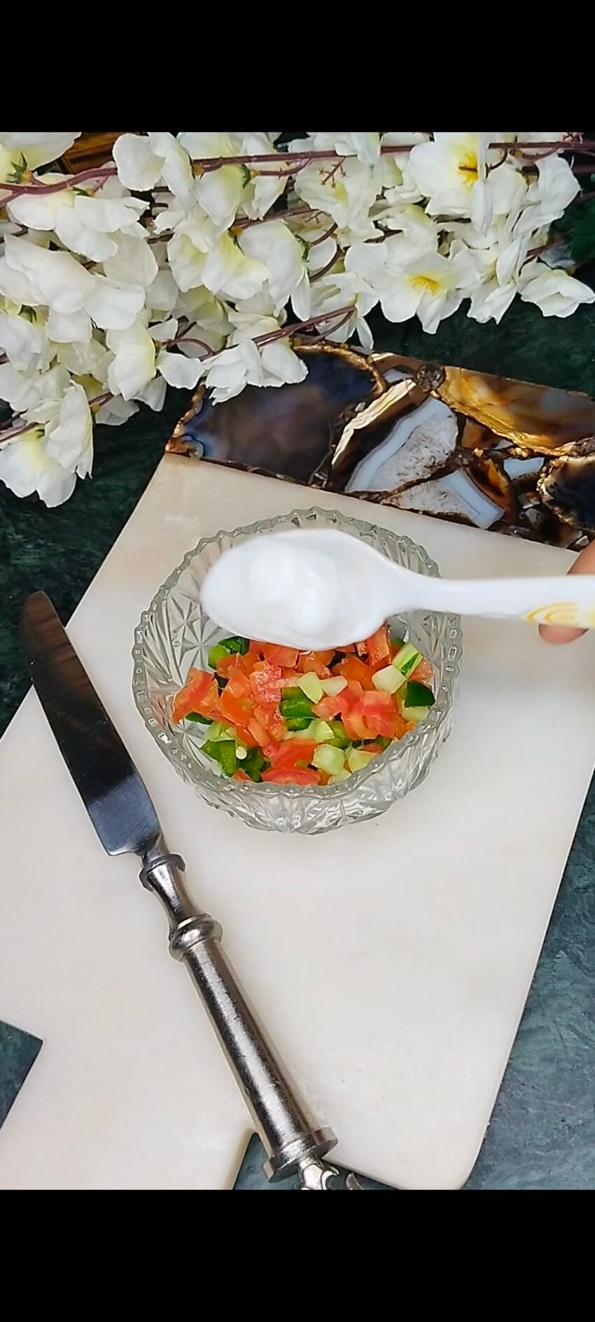 - Cucumber + onion + tomato + lemon + green chili