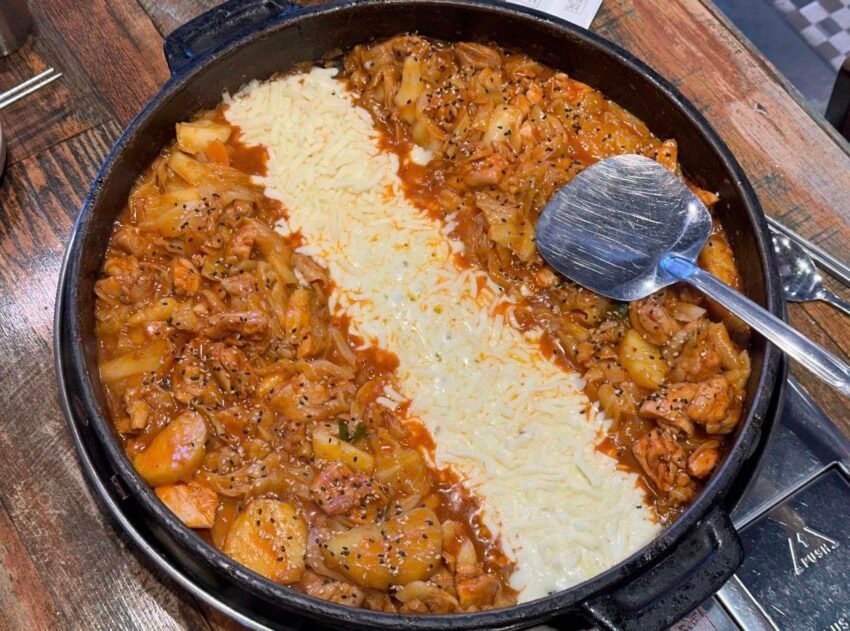 At the center was Dak-galbi, a Korean dish full of heat and comfort. Pieces of chicken cooked together with cabbage, sweet potatoes, and rice cakes, all coated in a deep red chili paste that clung to everything.