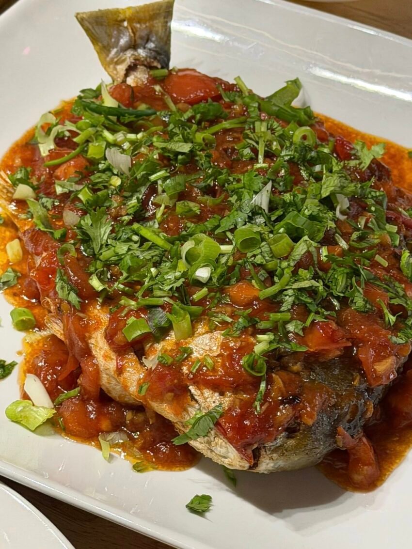Fish head with pickled red peppers is a bold, savory dish often found in Chinese-style cooking. It features a tender fish head simmered in a spicy, tangy sauce made with pickled red chilies, garlic, and aromatics. The result is rich, slightly sour, spicy, and deeply flavorful.