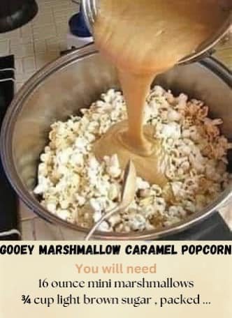 Gooey Marshmallow Caramel Popcorn is a sweet, sticky snack made by coating popcorn in melted marshmallows and caramel-like sugar syrup. It’s soft, chewy, and perfect for parties or movie nights.
