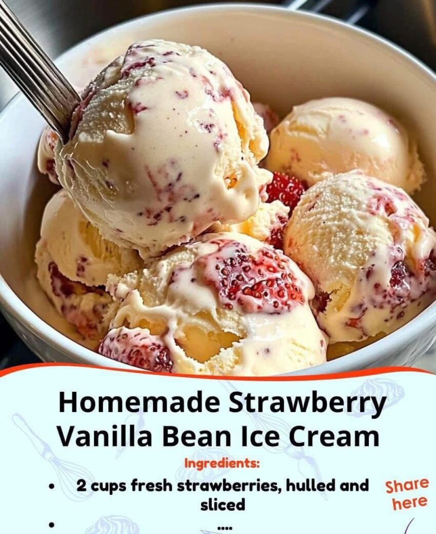Homemade Strawberry Vanilla Bean Ice Cream is a creamy, fruity dessert with real strawberry flavor and rich vanilla specks. You can make it with or without an ice cream maker.
