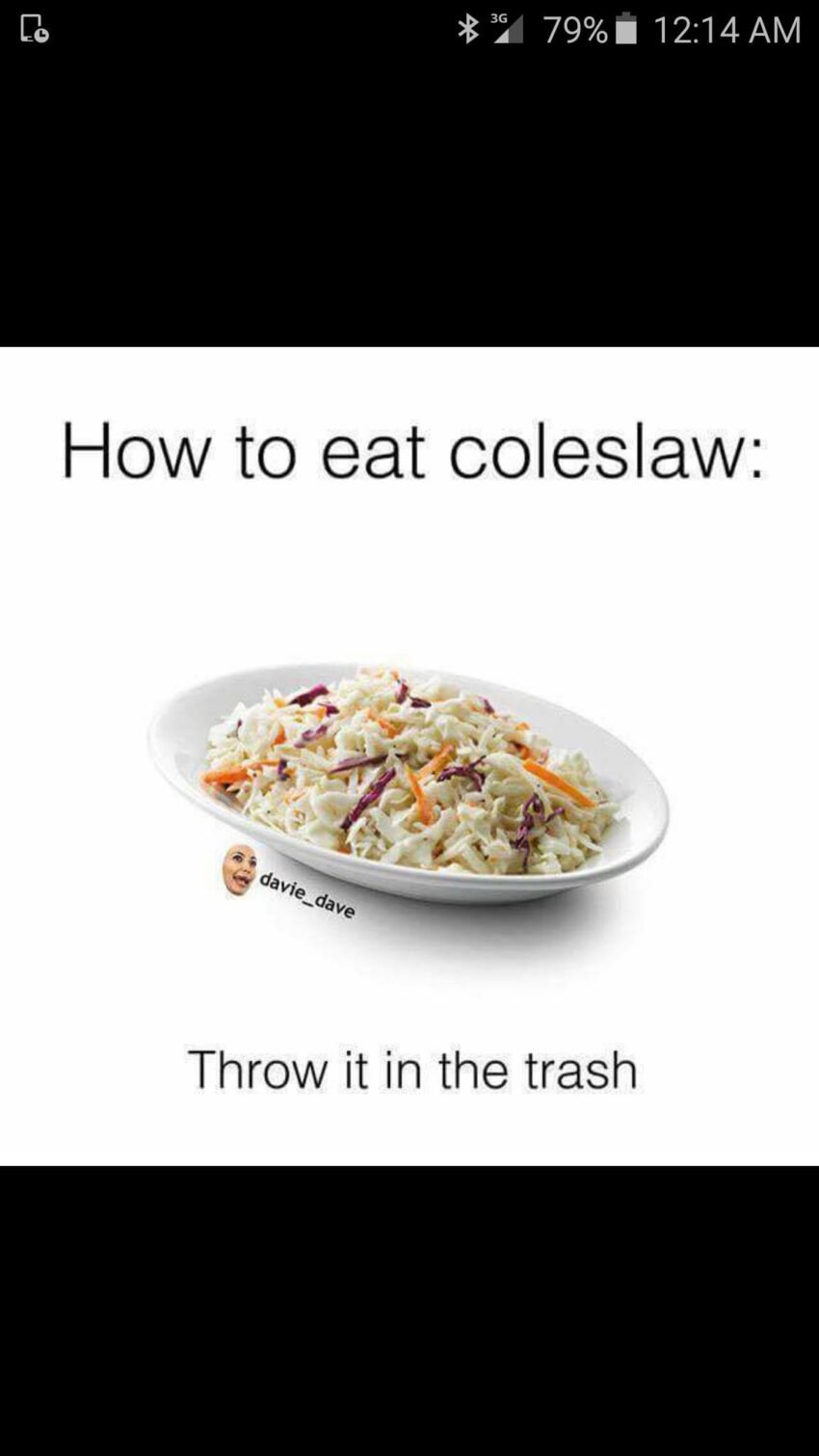 The “How to eat coleslaw” meme is usually a joke about people treating coleslaw like it’s confusing, overly complicated, or something you need instructions for — when in reality it’s just a simple side dish of shredded cabbage salad.