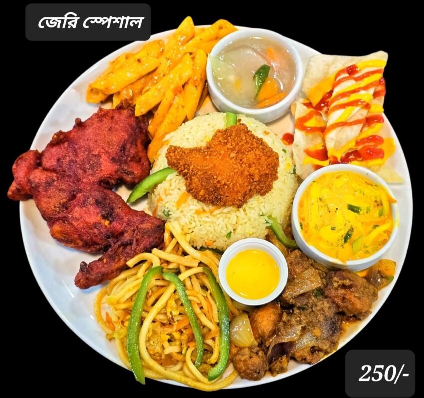 Jerry Special Platter includes Tandoori chicken, fried rice, noodles, pasta, spring rolls, and dip sauces.