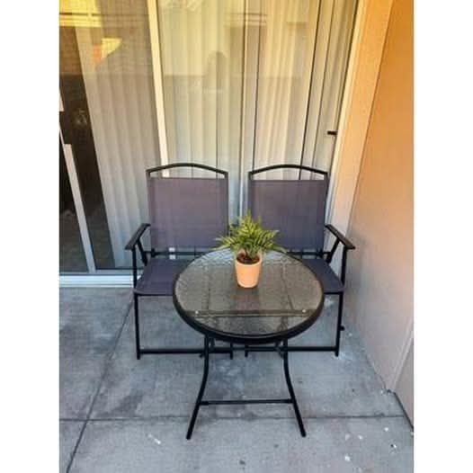 The box was light enough to carry with one hand, but it held a promise of something simple and useful.Inside was the Mainstays Albany Lane 3-Piece Outdoor Bistro Set – MS562807941911: two folding chairs and a small round table with a glass top. Nothing extravagant. Just clean lines, black steel, and a design meant for small outdoor spaces.
