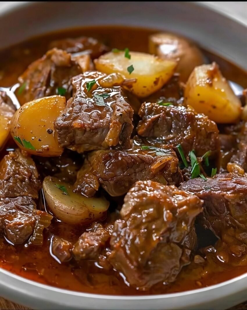 Filipino-style beef stew in tomato sauce with a slightly tangy, savory flavor