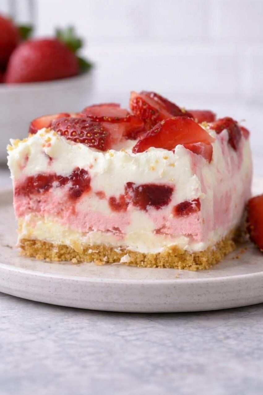 A light, creamy, layered dessert with strawberries, biscuits, and a smooth cream fillingโno oven needed. It sets in the fridge and tastes like a mix between cheesecake and strawberry pudding.