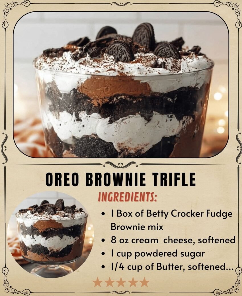 Oreo brownie trifle is a layered, indulgent dessert that combines fudgy brownies, creamy pudding or whipped layers, and crushed Oreo cookies.