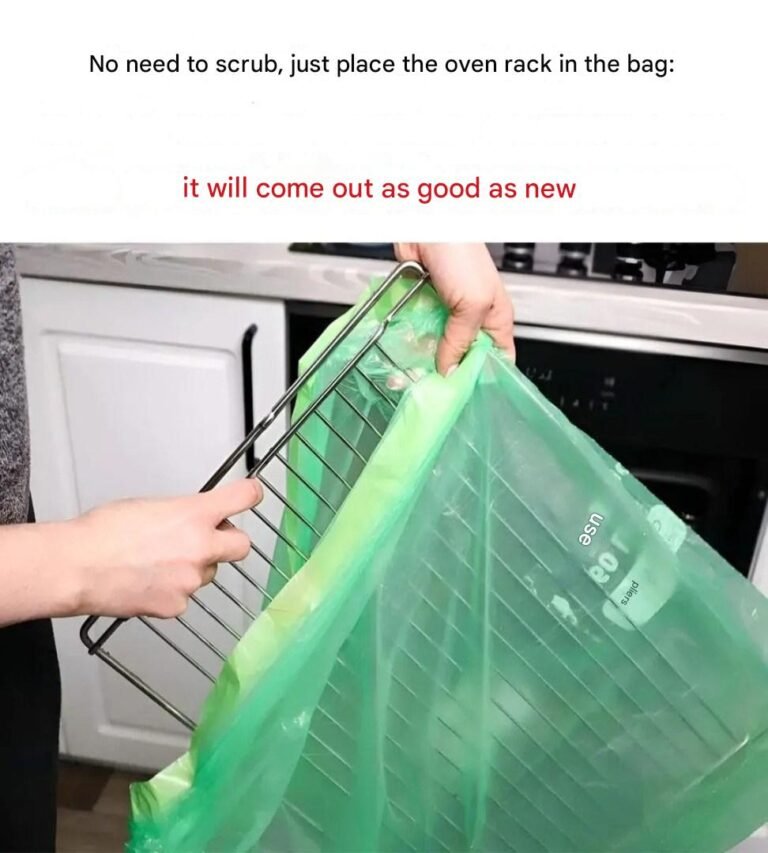 “Oven rack in a bag” is a soaking method that softens burnt grease overnight, making oven racks much easier to clean with minimal scrubbing.