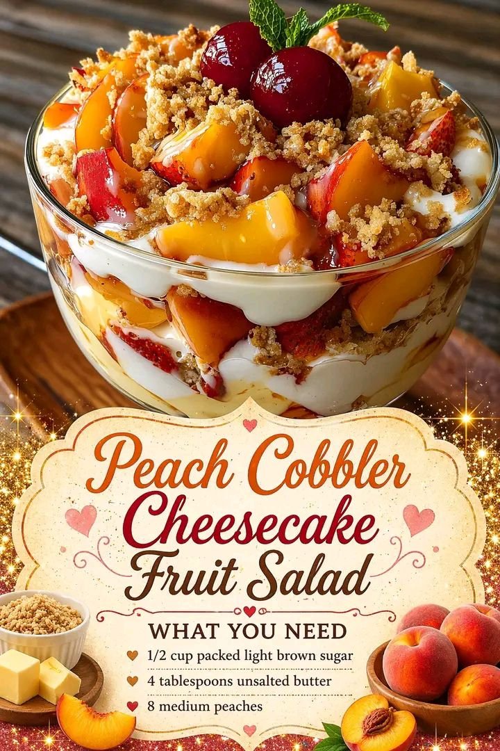 Peach Cobbler Cheesecake Fruit Salad is a rich, creamy no-bake dessert that combines juicy peaches, a sweet cheesecake-style dressing, and buttery “cobbler-like” crunch. It tastes like peach cobbler and cheesecake mixed into a chilled fruit salad.