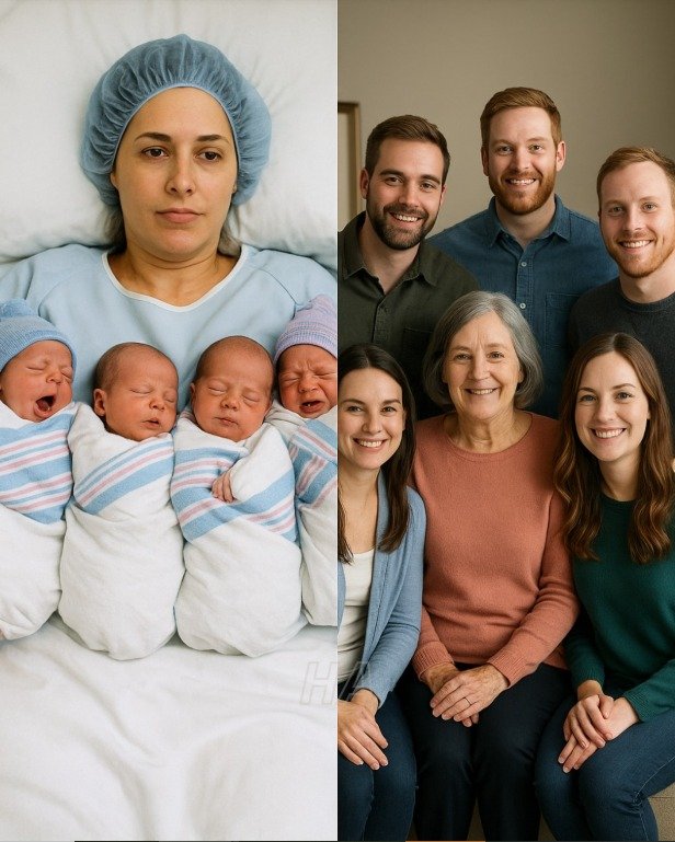 “A highly emotional, realistic hospital room scene. A person lies in a hospital bed, gently resting under white blankets, surrounded by soft medical lighting. On one side of the bed are four newborn infants in hospital bassinets, softly lit and peaceful. On the other side stands a family gathered closely, holding a framed group portrait and looking at the patient with a mix of hope and emotion. The room is clean, modern, and quiet, with medical equipment subtly visible in the background. Cinematic composition, shallow depth of field, warm natural tones, ultra-detailed realism, 35mm film photography style, focus on emotional storytelling.”