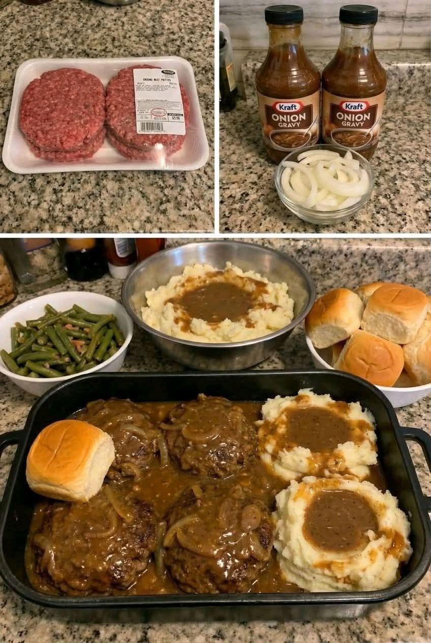 Salisbury steak is a classic comfort food made from seasoned ground beef patties served in a rich onion-mushroom gravy. It’s hearty, savory, and often paired with mashed potatoes or rice.