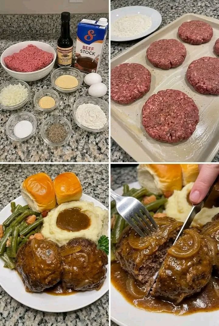 Salisbury steak is a classic comfort dish made from seasoned ground beef shaped into oval “steaks” and served with a rich brown gravy. Despite the name, it’s not actual steak—it’s closer to a dressed-up hamburger patty.