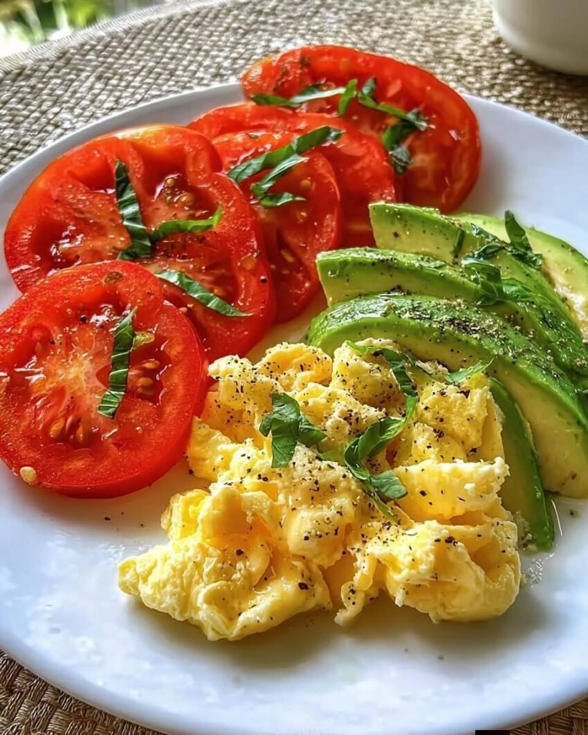 Scrambled eggs with avocado and tomato is a fresh, protein-rich breakfast or light meal that combines soft, creamy eggs with buttery avocado and juicy tomatoes. It’s simple, nutritious, and very quick to make.