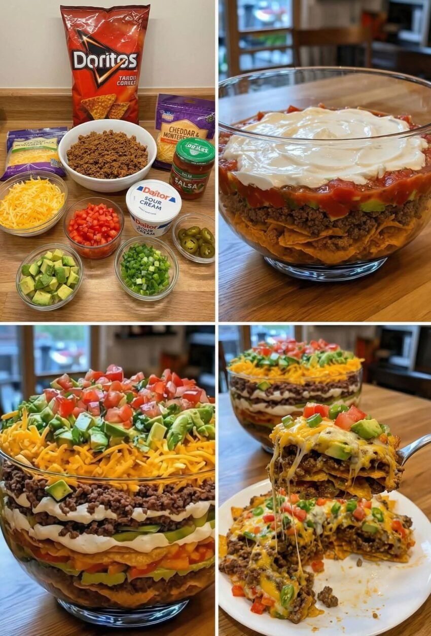 Seven-layer taco salad is a colorful, layered Tex-Mex dish that’s crunchy, creamy, and packed with flavor. It’s usually served in a glass bowl so you can see all the layers—like a savory version of a trifle.