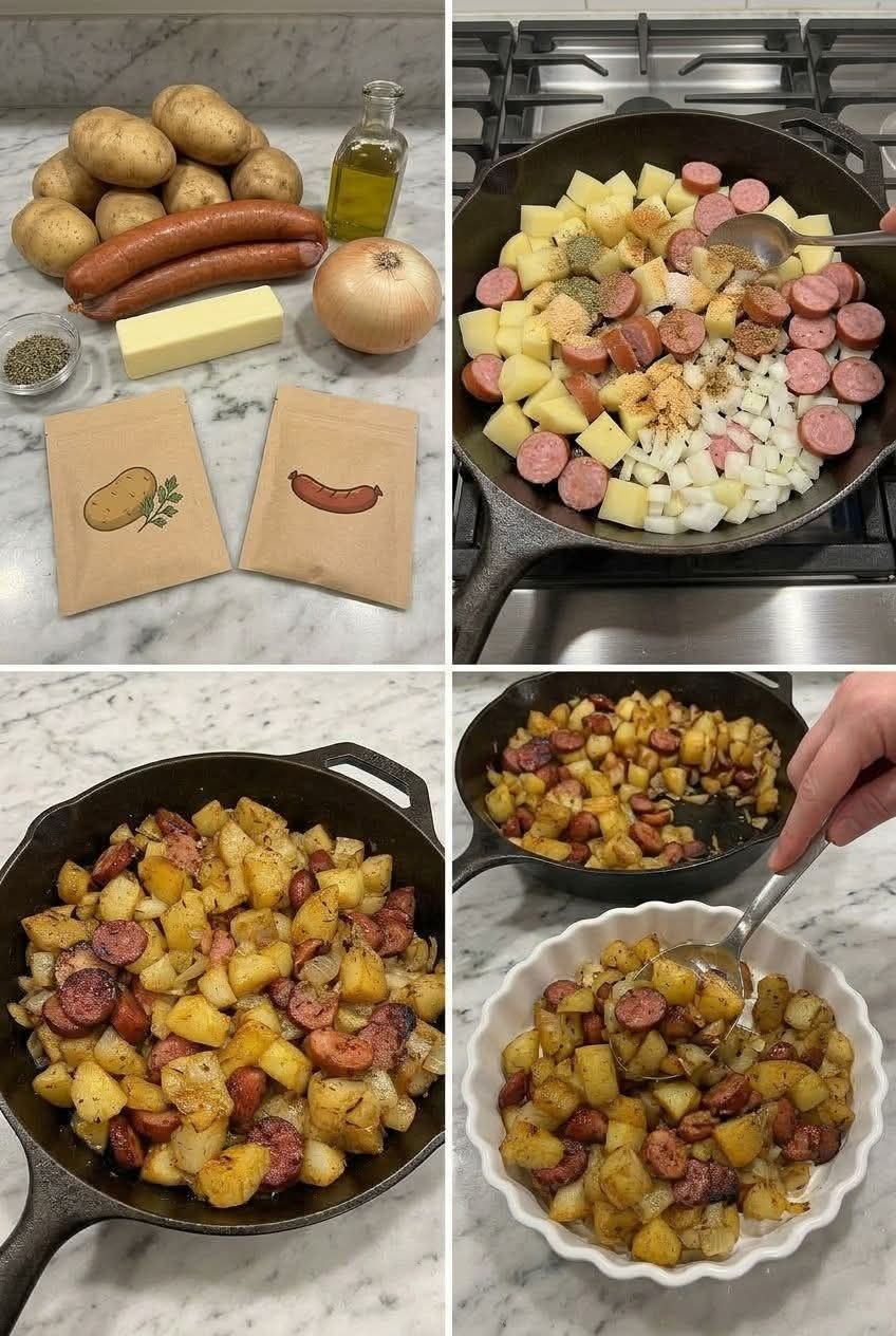 Sliced kielbasa sausage and potatoes is a simple, hearty skillet meal made with smoky sausage, golden potatoes, and onions. It’s crispy, savory, and perfect for a quick one-pan dinner.