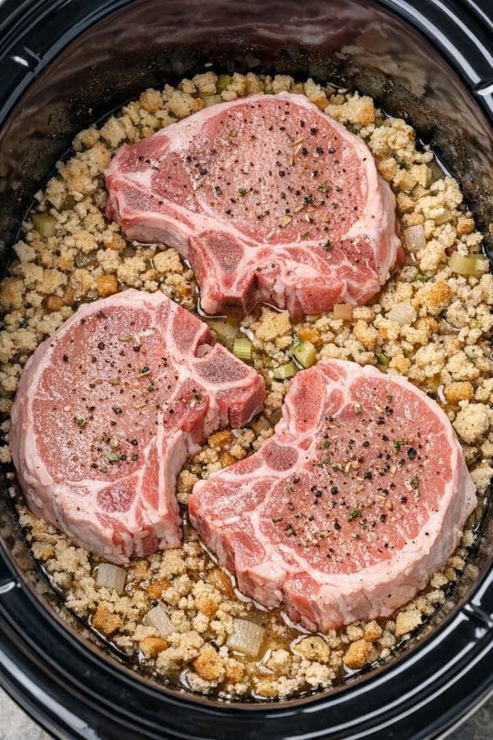 - Place pork chops in the slow cooker