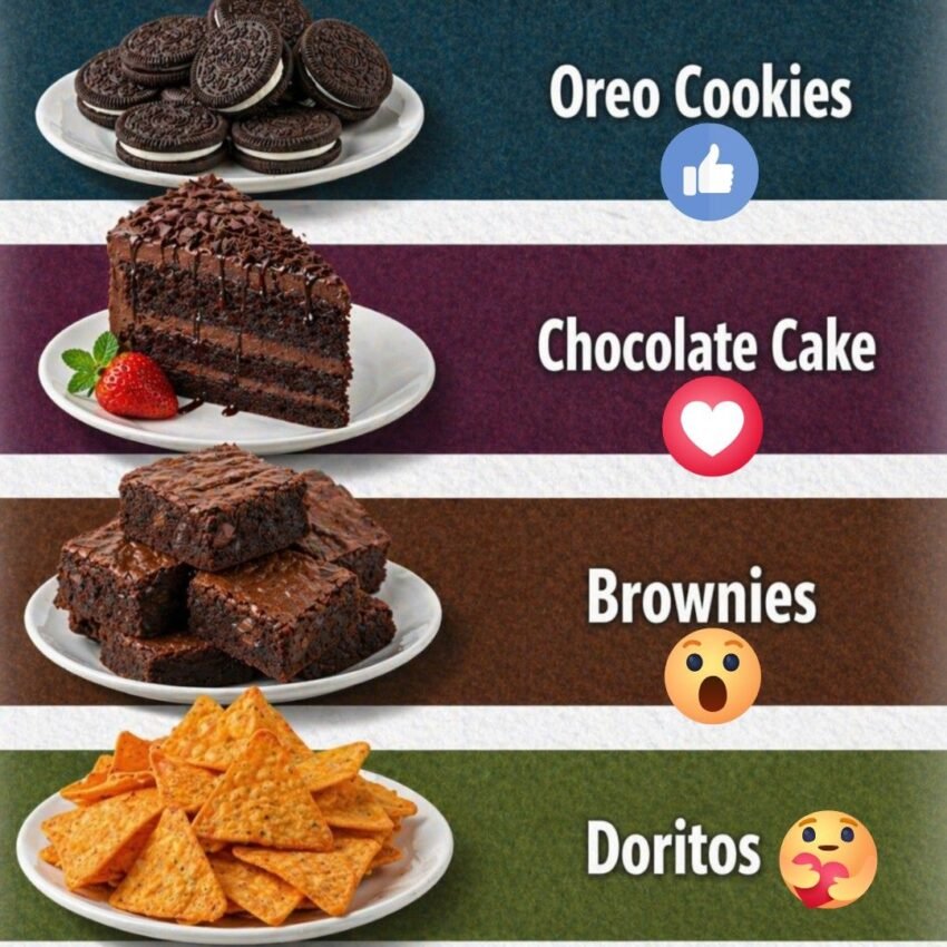 snack foods: Oreo Cookies paired with a thumbs-up emoji. A slice of Chocolate Cake paired with a heart emoji. Brownies paired with a shocked face emoji. Doritos tortilla chips paired with an emoji holding a heart.