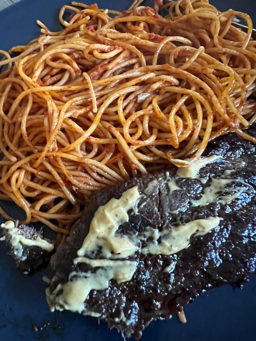 Spaghetti with steak and mushrooms is a hearty pasta dish that combines tender beef steak, sautéed mushrooms, and spaghetti noodles, usually finished with a savory sauce.