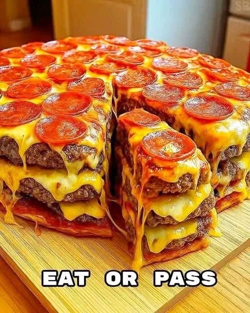 A stacked cheeseburger pepperoni pizza is an over-the-top fusion dish that combines a cheeseburger layer + pizza toppings + pepperoni all baked together into one loaded, hearty meal.