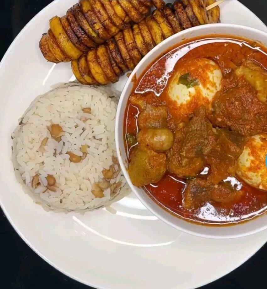 It sounds like you’re referring to a plate of white rice, beans, and stew—a very common meal in many West African cuisines (especially Nigerian-style dishes).