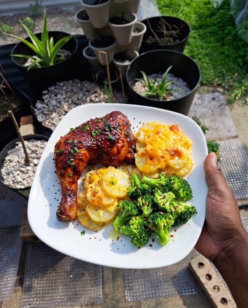 That’s a solid plate—sweet-savory chicken, creamy mash, and roasted veggies all in one balanced meal.