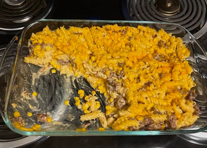 The item in the image is a Loaded Cowboy Cheeseburger Casserole.