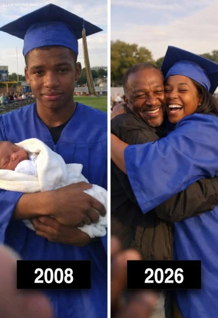 In 2008, the moment was filled with anticipation—a graduate stood in a cap and gown, holding a small child close, the future still uncertain but full of hope. There was pride, but also quiet determination, as if that day marked not just an achievement, but a promise to build something better for the life in their arms.