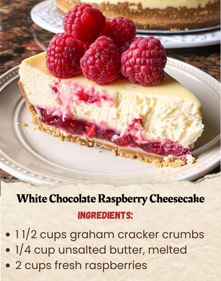 White chocolate raspberry cheesecake is a rich, creamy dessert made with a smooth cheesecake base flavored with white chocolate and swirled or topped with tart raspberries. It balances sweet, creamy, and slightly tangy flavors.